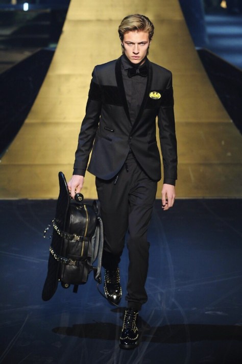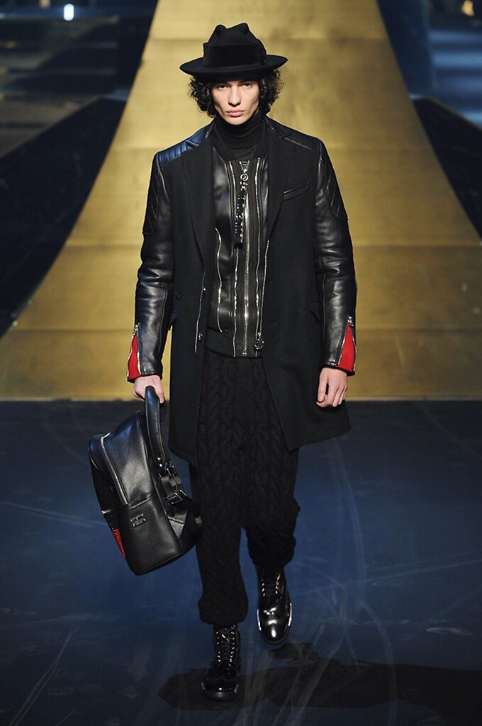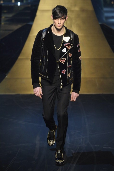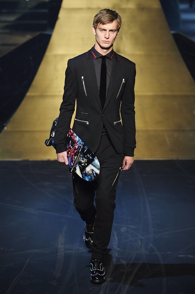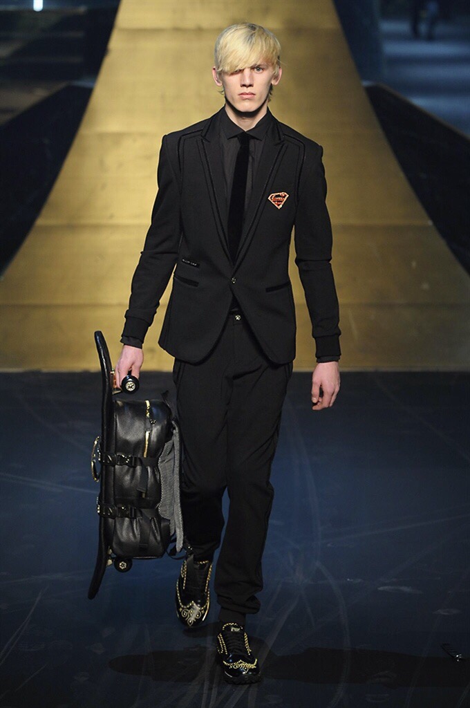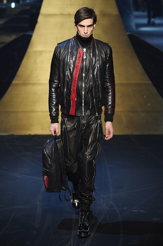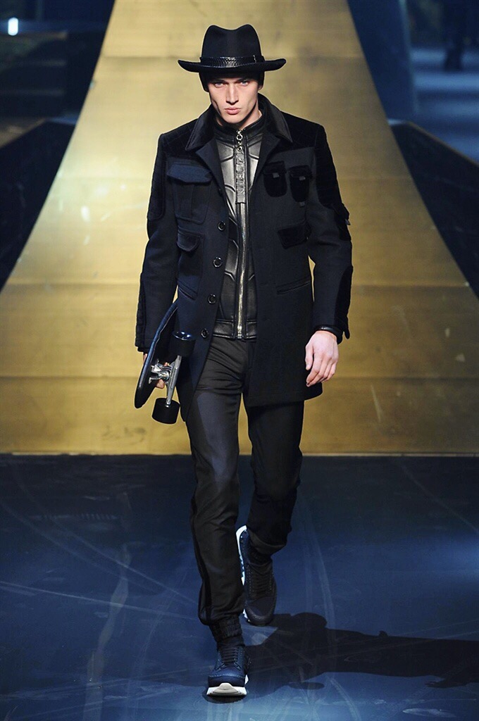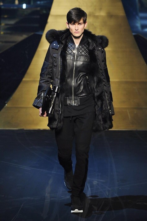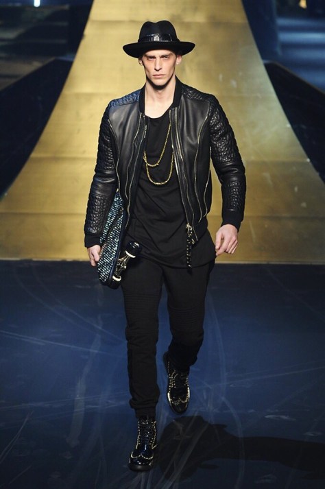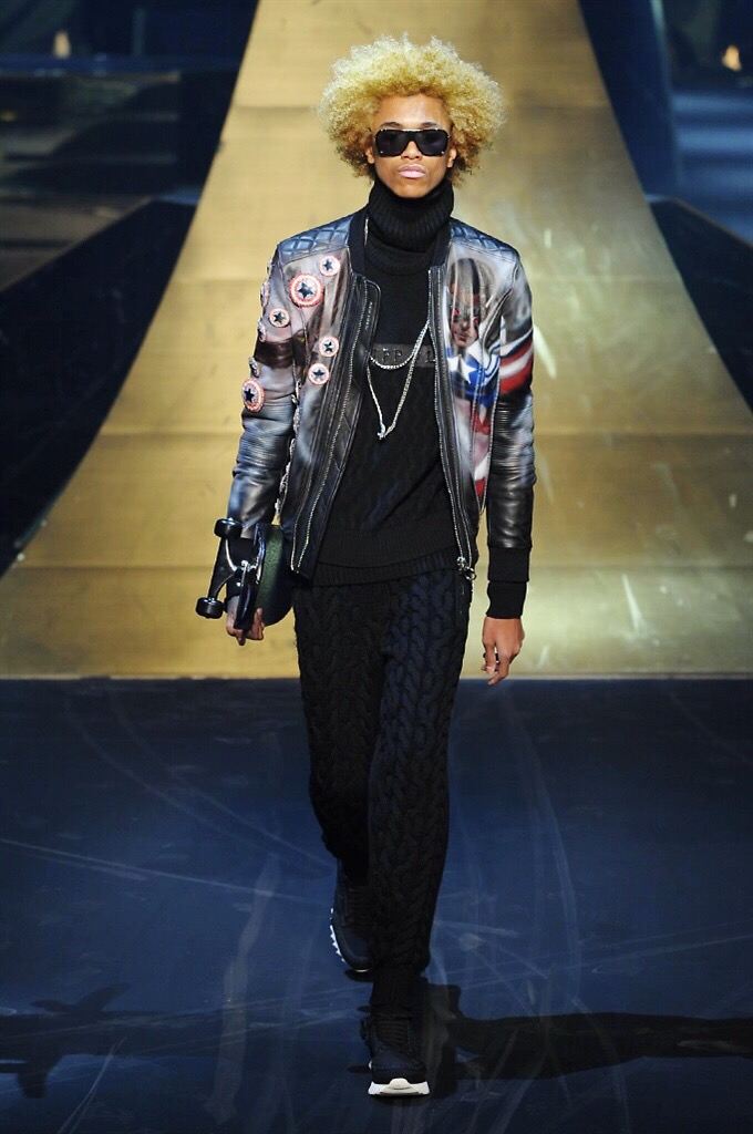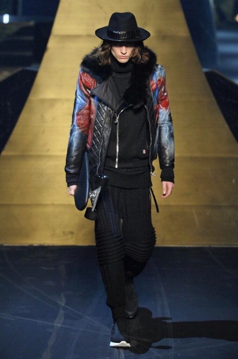 Alla Fabbrica del Vapore si mescola la musica da disco a quella di Wagner, effetti sonori ed effetti ottici e tanta, tanta voglia di scatenarsi. Va in scena la sfilata di Philipp Plein , ad aprire lo show un gruppo di bikers in Bmx e skaters attaccati a corde flou. L’uomo Plein è un’urban-hipster di impronta trasgressiva i capi di punta sono le giacche, in pelle stile bikers, e bomber dal piglio urban , cappelli, guanti bandane , biker boots e chiodi da portare su t-shirt ispirate ai super eroi e i completi con chiusura a scialle che fanno la differenza. Tavole logate con Batman e Captain America. Philipp Plein porta in passerella gli skater di nuova generazione, dallo spirito hipster e lo stile dark. È la svolta «taylor-made» ! il piatto forte: molta pelle, tante borchie, pantaloni di pelle, classico Plein, ma anche fatti a maglia. Il ritorno della borsa, maxi o zaino, anche questa con impresso il marchio del supereroe di turno. La collezione tutta nera intervallata da intarsi grigi spalmati di Swarovski. Special Guest il rapper Lil Wayne che tra effetti speciali e la Cavalcata delle Valchirie suonata dal vivo da un’orchestra classica Ci ha emozionato TUTTI!