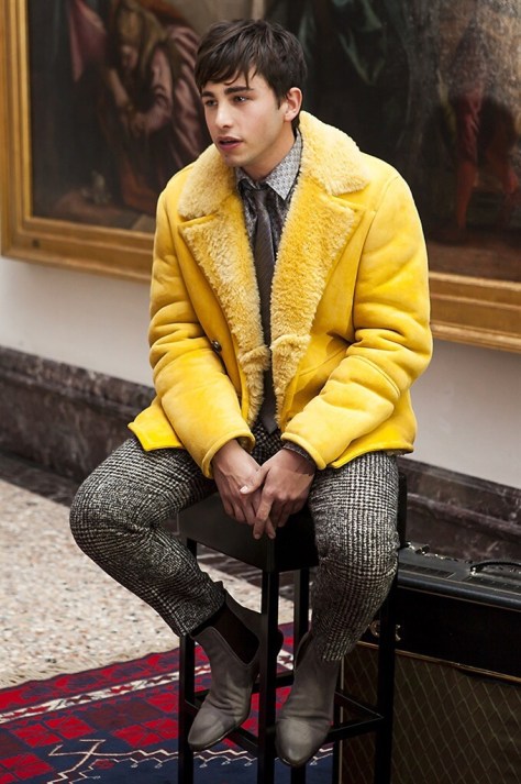 I tessuti sono velluti a coste, il principe di Galles, il tweed che si amalgamano ai disegni cravatta portati con noncalanche. I colori sono l’ocra, il marrone, il grigio, il blu che giocano e si mescolano in una armonia sottolineata dalla musica.