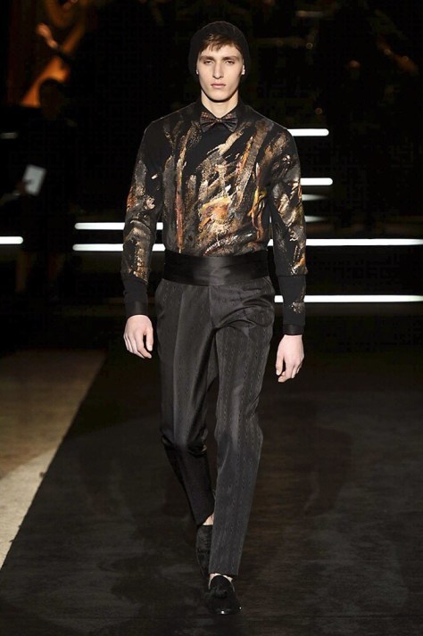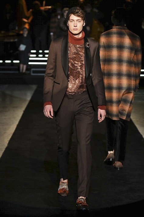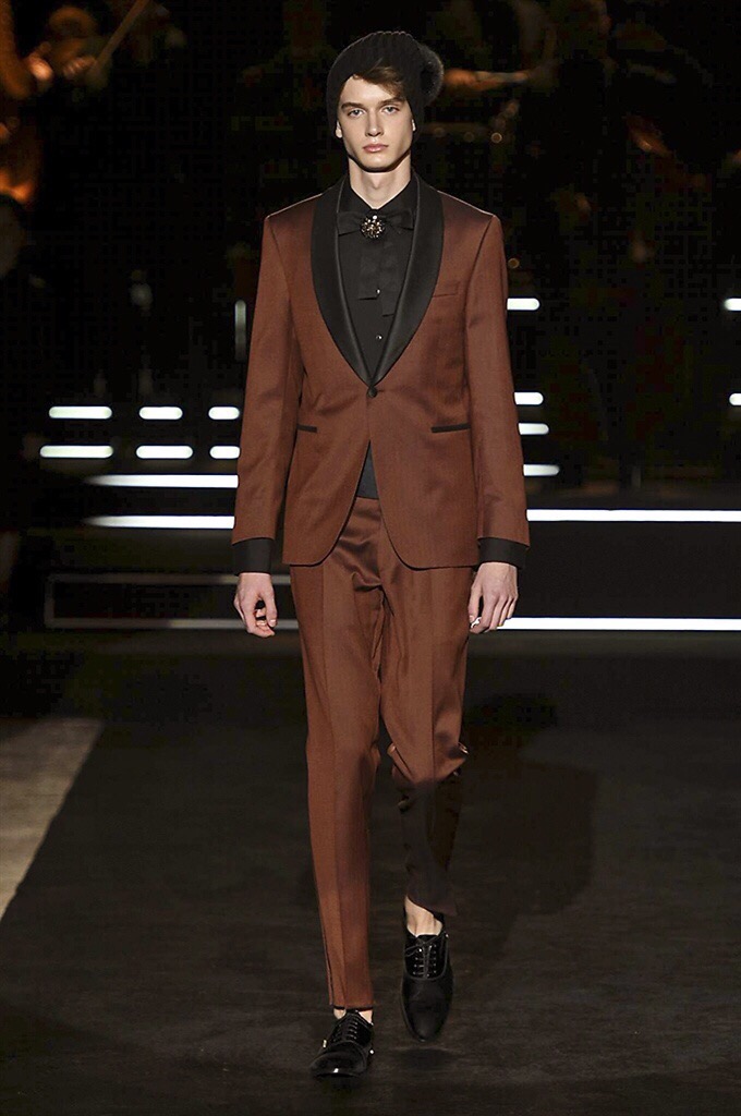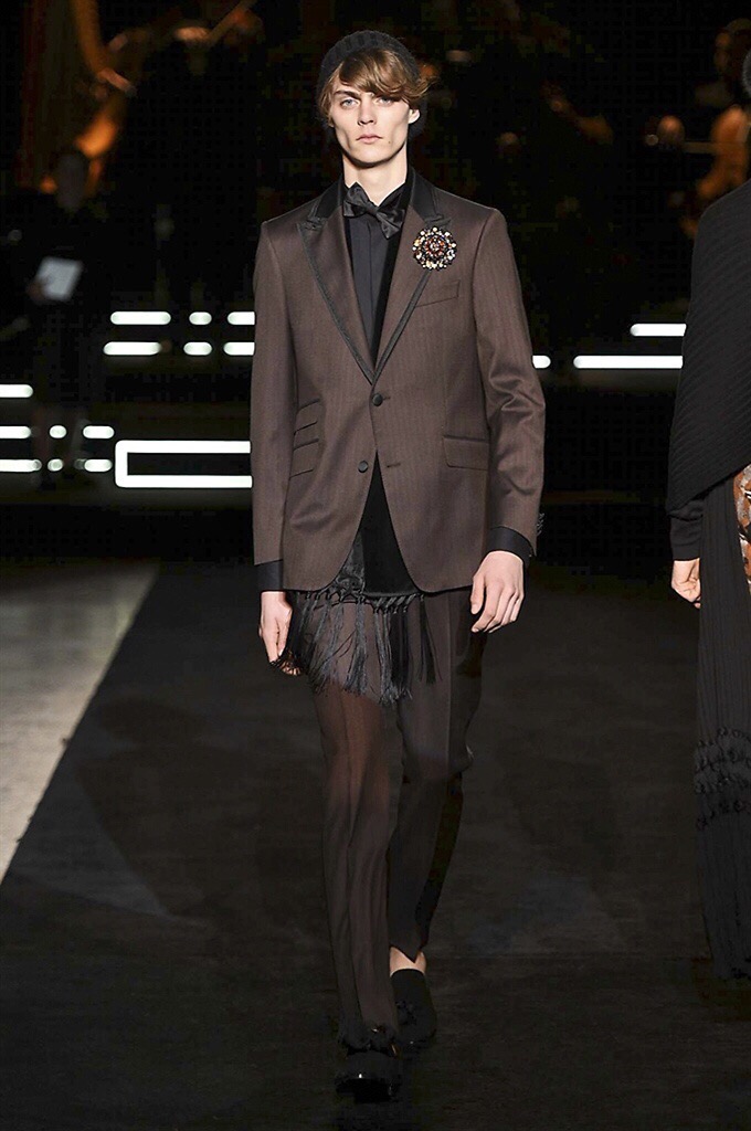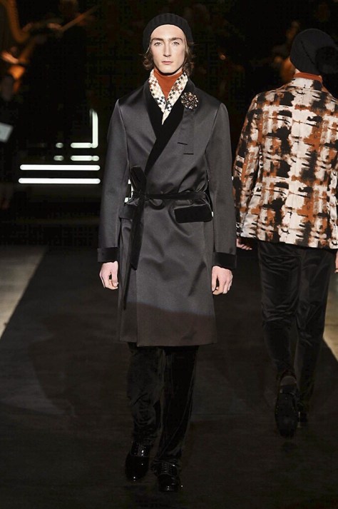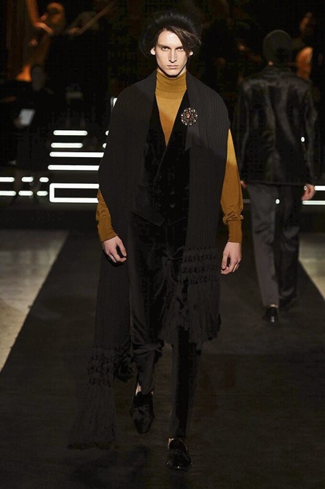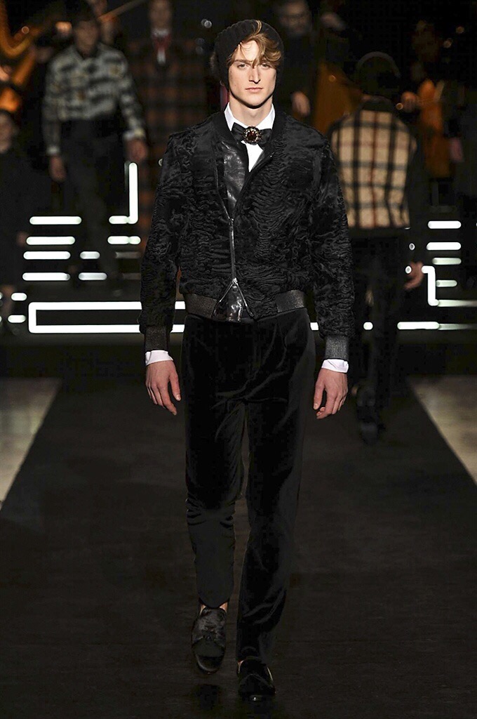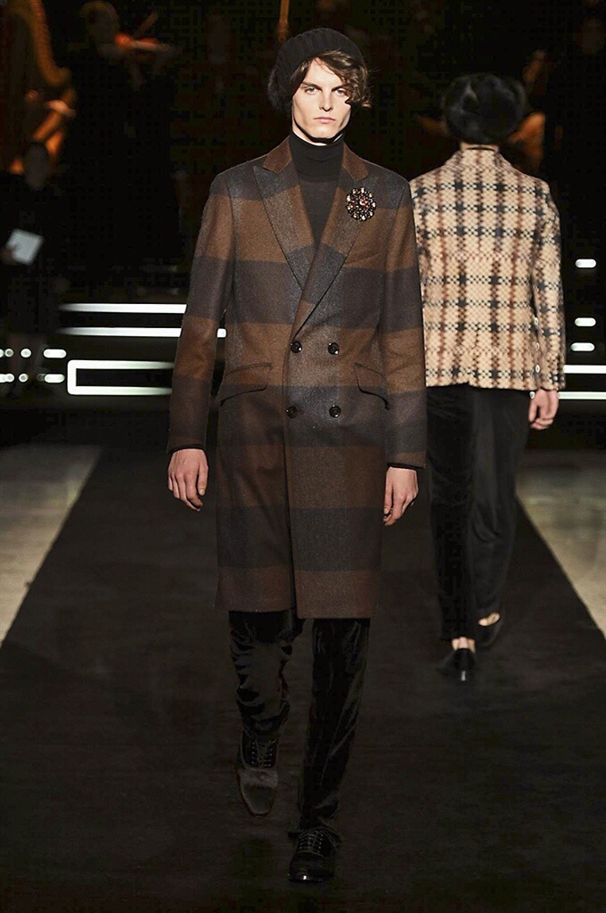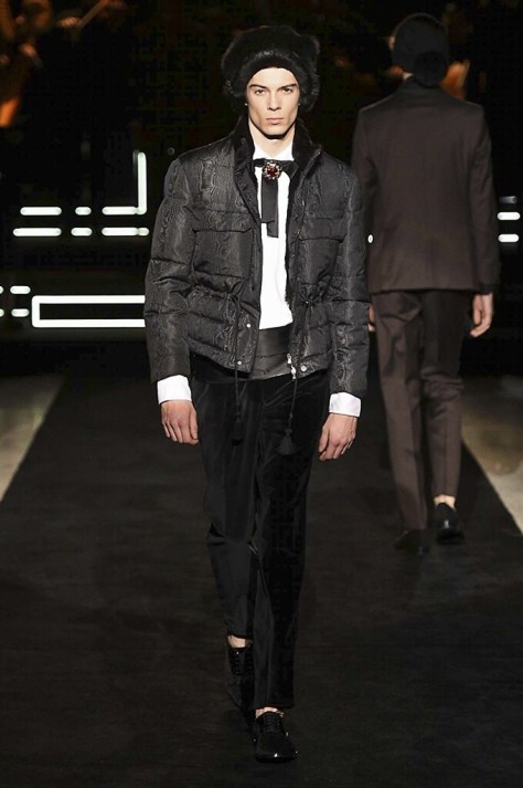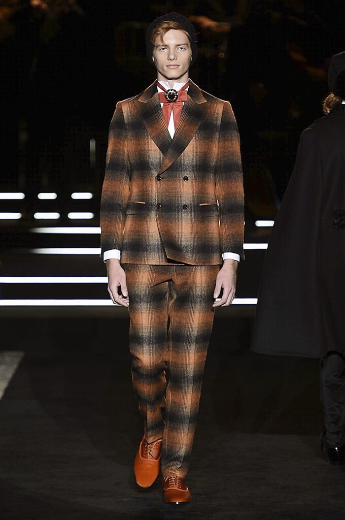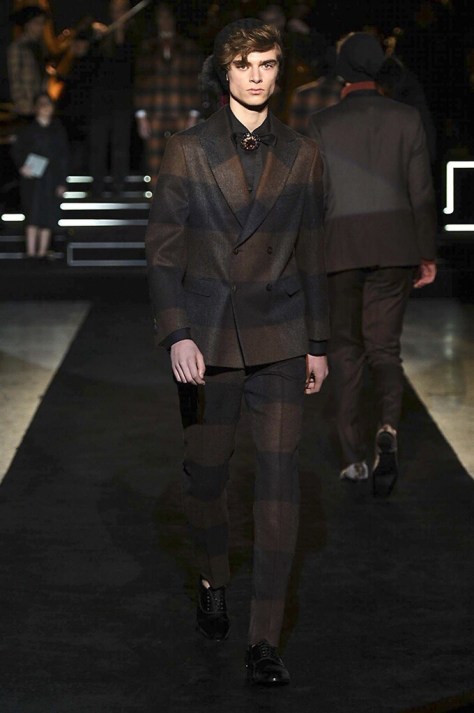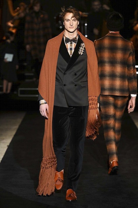 il direttore creativo di Daks, Filippo Scuffi, omaggia l’English Evening. Una collezione ispirata a quell’irresistibile fascino inglese dall’eleganza senza tempo. Un po’ stile transilvano e un po’ dandy, l’uomo di Daks incede elegantemente sulle passerelle della Milano Fashion Week maschile, presentando la nuova collezione per l’autunno inverno 2016-2017, fatta di abiti scuri, mantelle e spille goth-chic. Smoking rivisitati , georgette e chiffon rivestono le camicie, arricchite da plastron ton sur ton ed in contrasto, sia materiale che cromatico. Velluto nero, raso di sera e il “moiré” che esprimono a pieno l’animo Dandy. La maglieria è preziosa nella migliore tradizione Daks: cashmere, alpaca e mohair che diventano una pregiata tela dove poter dipingere un’opera unica e irripetibile, realizzata a mano da un artista Italiano. Le borse in suede, rifinite da dettagli in pelle plongé. Bronzo, rusty in varie shade di luminosità, e una sfumatura di ocra più cupo si uniscono al nero nel creare le tonalità scelte da Filippo Scuffi per la Collezione. Daks va a tradurre l’elegante ironia, a tratti surreale, che da sempre gli Inglesi insegnano al mondo: elementi in apparente contrasto tra loro che si trasformano in una veste da sera. Giacchini tecnici rivestiti di velluto panné di stea, il parka tipicamente brit, fatti in velluto foderato di montone, l’etnico poncho in velluto di seta, con delle frange di raso da indossare sotto la giacca da smoking, fino ai pantaloni da equitazione, che perdono la loro essenza sportiva per scoprire l’eleganza sottolineata da una cintura in raso di seta. Gli accessori sono pensati per poter sottolineare con grande ironia leggera, la grandissima eleganza della Collezione: cappelli di lana con pon pon di pelo, fiocchi e nastri di gros-grain applicati sul rever della giacca a mo’ di fiore ed eleganti spille che ricreano con la luce dei cristalli i colori dell’iconico house-check Daks. La Collezione prende vita in uno spettacolo, circondato da una Location molto esclusiva e con un set-up teatrale dove i modelli, dal Look “Brit” e sognante, si trasformano in raffinati dandy.