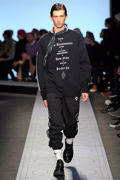 Marcelo Burlon torna sulle passerelle milanesi con nuove regole, in pedana sfoggia le collaborazioni studiate con Kappa, Reebok, Alpha industries, Starter e Ilariusss