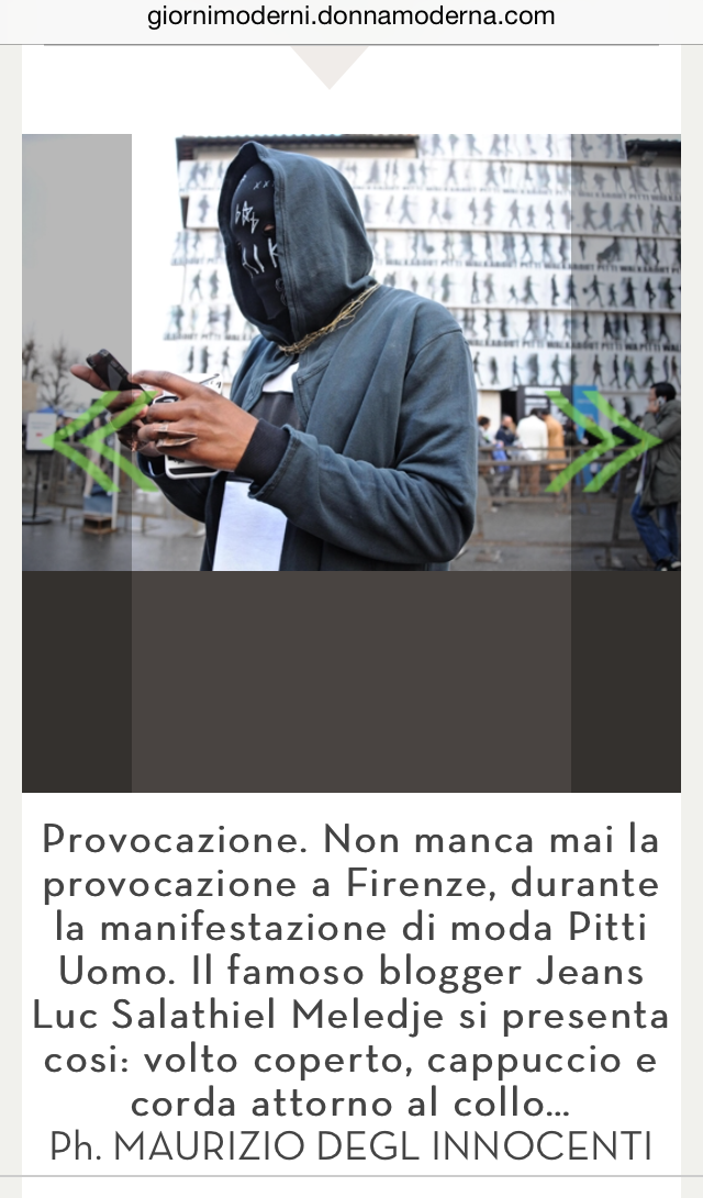 Provocazione. Non manca mai la provocazione a Firenze, durante la manifestazione di moda Pitti Uomo. Il famoso blogger Jean Luc Salathiel Meledje si presenta cosi: volto coperto, cappuccio e corda attorno al collo…<<