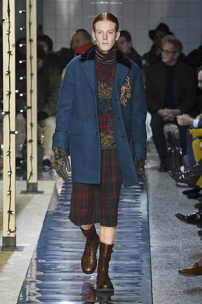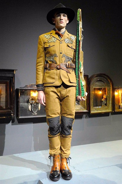 Antonio Marras, che ha sfilato sulle passerelle di Milano Moda Uomo ci riporta nel vecchio West, quello dei cowboys e degli indiani, dei cercatori d’oro e dei cacciatori di pellicce, delle donne dei saloon, de La casa della prateria, de Il buono, il brutto, il cattivo e di Sette spose per sette fratelli è l’ispirazione della collezione autunno inverno 2016 2017. L’uomo Marras indossa capi ruvidi con tweed bottonati, giacconi a quadroni coperta, maglioncioni mĂ©lange decorati, pantaloni in tartan e camicie in micro quadretti. La palette dei colori è quella della terra, del muschio, del verde bosco, militare, tortora, marrone, fango, corda, petrolio, grigio piombo e antracite e poi rosso e senape. Per i grandi freddi strati e strati di giacconi camouflage mĂ©lange imbottiti, cardigan con cappuccio in jersey infeltrito, maglioni a grandi righe, camicie intarsiate e pantaloni in velluto , giubbini biker in pelle o in stampa pitone, jeans patch o salopette e grembiuloni in denim per il duro lavoro e il gessato, il principe di galles o tessuto jacquardato a fiori. E camicie a quadri di ogni natura e provenienza. Rattoppate, intarsiate, ricamate e decorate. Immaginatevi un posto simile a poche ore da casa, in piena Sardegna. Immaginate un vecchio paese quasi disabitato, nel mezzo del nulla, alla fine di una strada sterrata che costeggia il mare. Una piazza deserta sotto al sole, case fatiscenti, polvere ed un ventone che fa rotolare le sterpaglie del deserto. Immaginatevi l’Albraxas, un locale il cui nome è tutto un programma. Immaginatevelo di notte, viaggiatori stanchi e amanti dei panorami selvaggi intenti a ballare al suono della fisarmonica. Marras ci fa sognare e fantasticare con la nostra mente. Una collezione che ci riporta alle origini, che ci ricorda che veniamo dalla terra ; una collezione dal tocco quasi “etnico”, senza dubbio eccentrica.